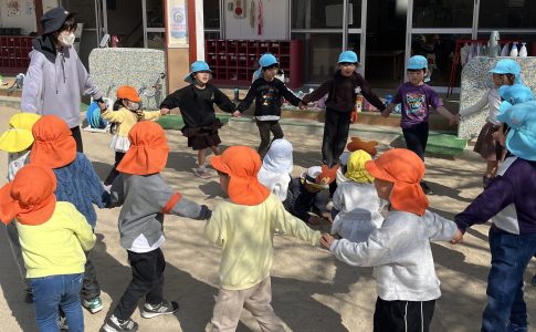 お知らせ水色帽子の年長組と、オレンジ帽子の年少組がわらべうたあそびを楽しんでいました!